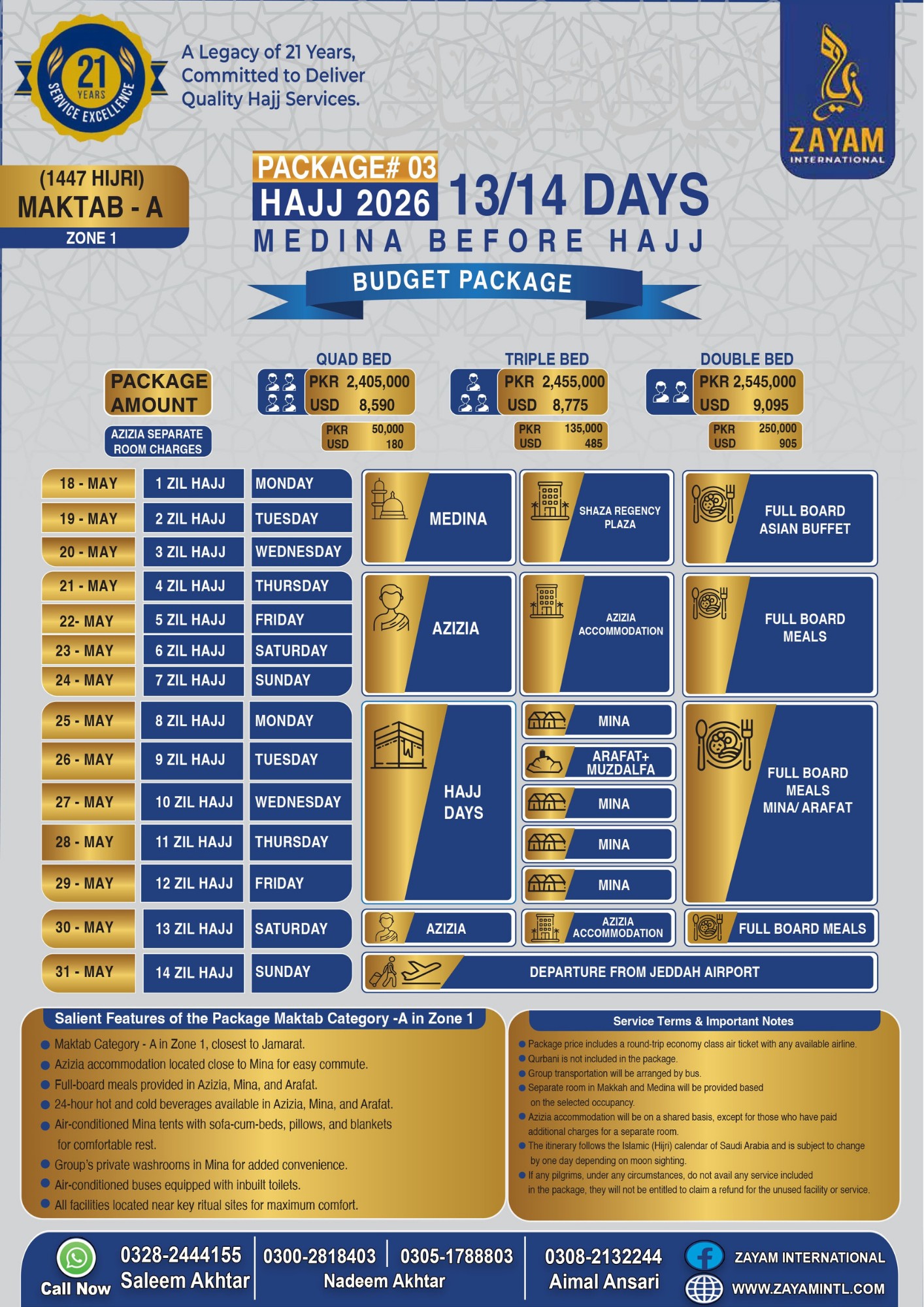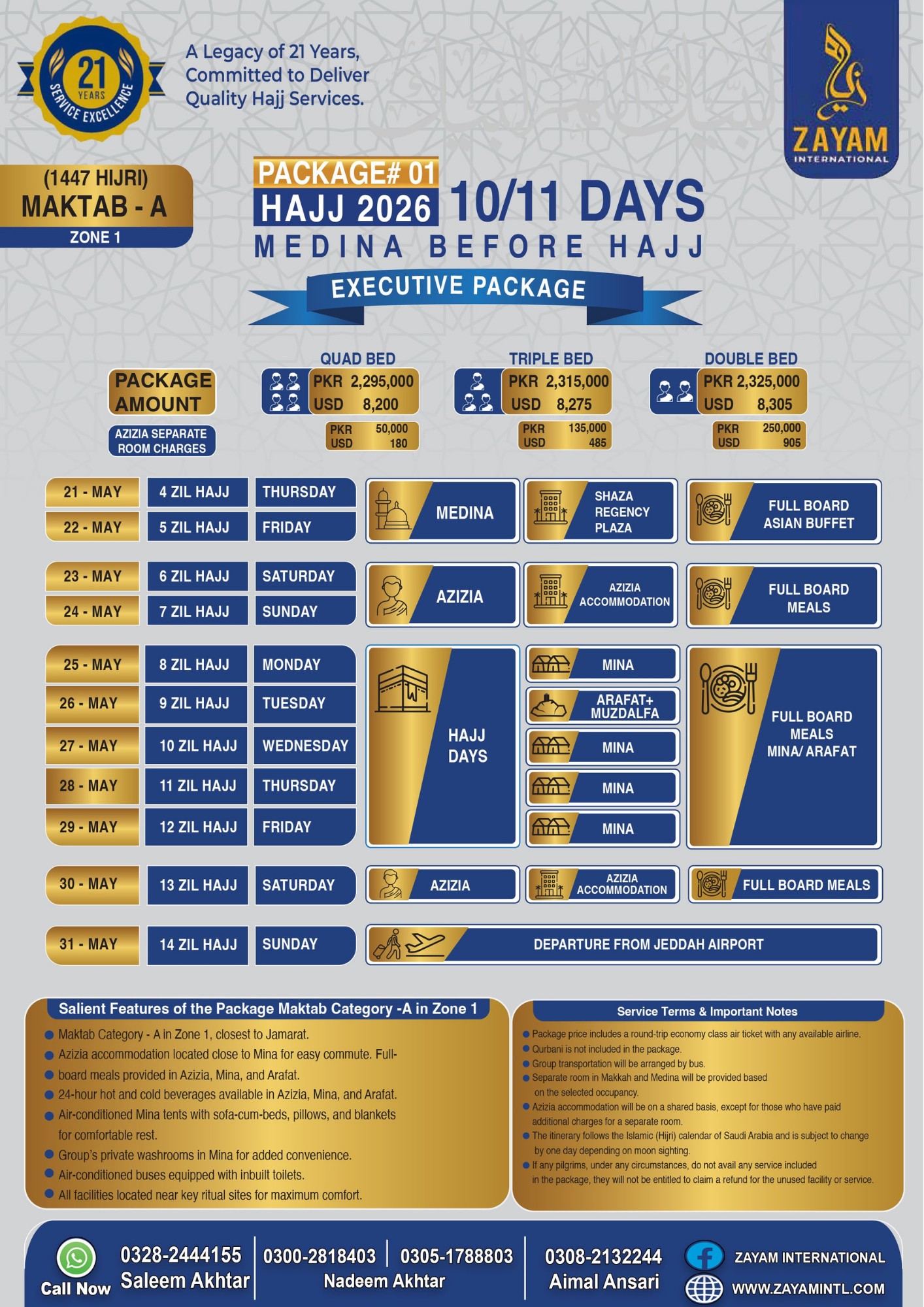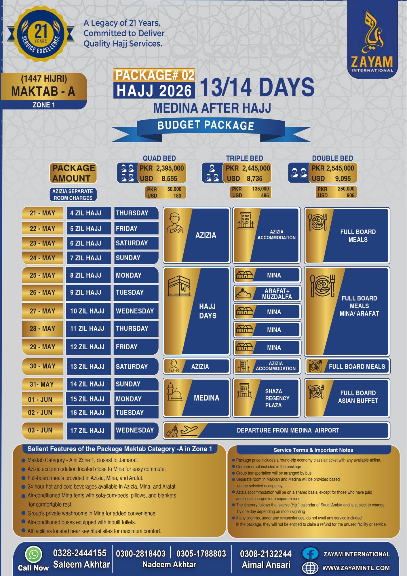 Elevate your pilgrimage with Zayam International’s 14‑Day Platinum Hajj 2026 — Medina Before Hajj — an impeccably orchestrated journey backed by 21 years of service excellence, delivering outstanding care, refined comfort and seamless coordination at every step. Begin in the luminous city of Madinah at the elegant Shaza Regency Plaza with a full‑board Asian buffet, continue to Makkah for a privileged stay at the iconic Movenpick or Swissôtel Al Maqam on half‑board, then proceed into the sacred rites across Mina, Arafat and Muzdalifah with prime Maktab Category A, Zone 1 placement (closest to Jamarat) before winding down in Azizia accommodation near Mina for effortless movement and full‑board meals; throughout, enjoy 24/7 hot and cold beverages in Azizia, Mina and Arafat, air‑conditioned coaches with onboard washrooms, and air‑conditioned Mina tents furnished with sofa‑cum‑beds, pillows and blankets, complemented by the group’s private washrooms and facilities positioned near key ritual sites for maximum ease. Round‑trip economy airfare is included, qurbani is not; group transport is by bus; rooms in Makkah and Madinah are provided as per selected occupancy while Azizia rooms are shared by default with optional private rooms available at an additional charge; the itinerary follows the Hijri calendar and may adjust by a day based on moon sighting, with departure from Jeddah Airport. Limited seats—reserve now and begin your Hajj journey with Zayam International for an excellent, truly outstanding experience.
