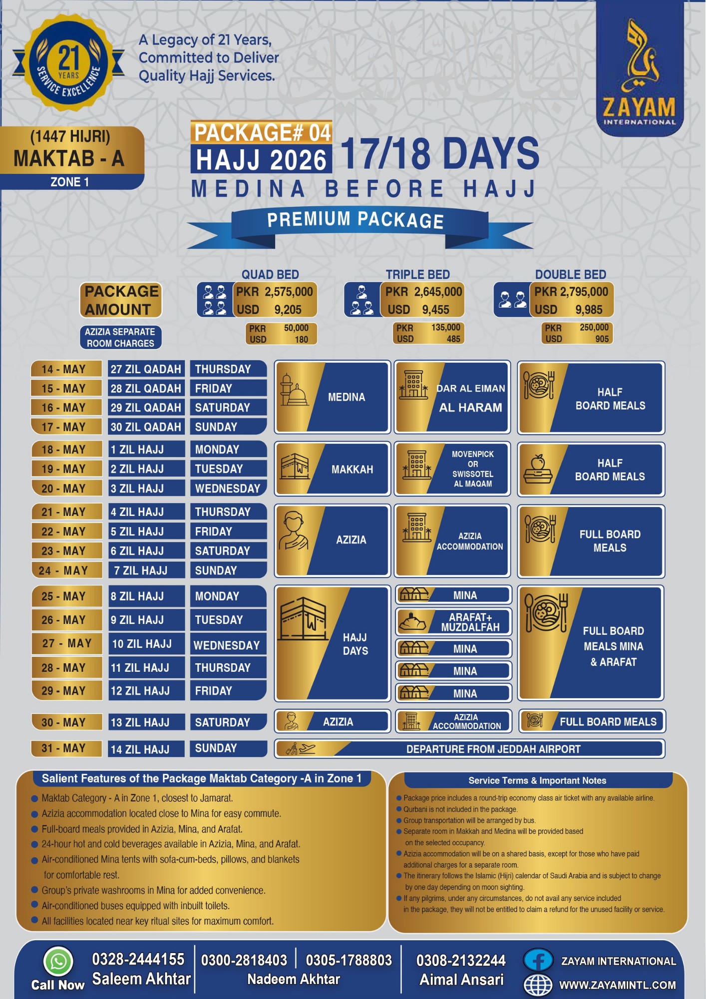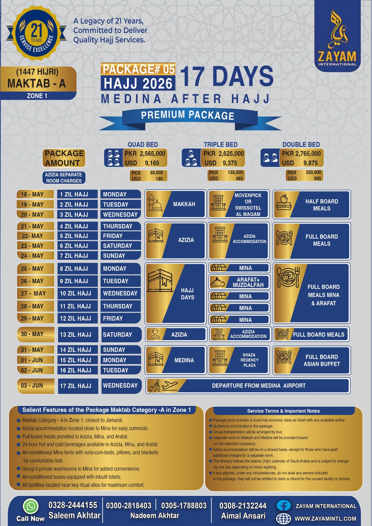 Experience an outstanding, excellence‑driven 17‑day Premium Hajj 2026 (Medina After Hajj) with Zayam International, starting in Makkah at the iconic Movenpick or Swissôtel Al Maqam, moving to Azizia for effortless access to the rites, performing the Hajj days in Mina, Arafat and Muzdalifah, returning to Azizia, and concluding in Madinah at Shaza Regency Plaza with departure from Madinah Airport. Enjoy prime Maktab Category A – Zone 1 placement (closest to Jamarat), air‑conditioned coaches with onboard washrooms, and air‑conditioned Mina tents furnished with sofa‑cum‑beds, pillows and blankets plus private group washrooms. Savor half‑board meals in Makkah, full‑board in Azizia, Mina and Arafat, and a full‑board Asian buffet in Madinah, with 24/7 hot and cold beverages in Azizia, Mina and Arafat. Round‑trip economy airfare is included, qurbani is not included, separate Azizia rooms are available at an additional charge, and the itinerary is subject to moon sighting. Limited seats—hurry and book now to begin your Hajj journey with Zayam International for an excellent, truly outstanding experience.